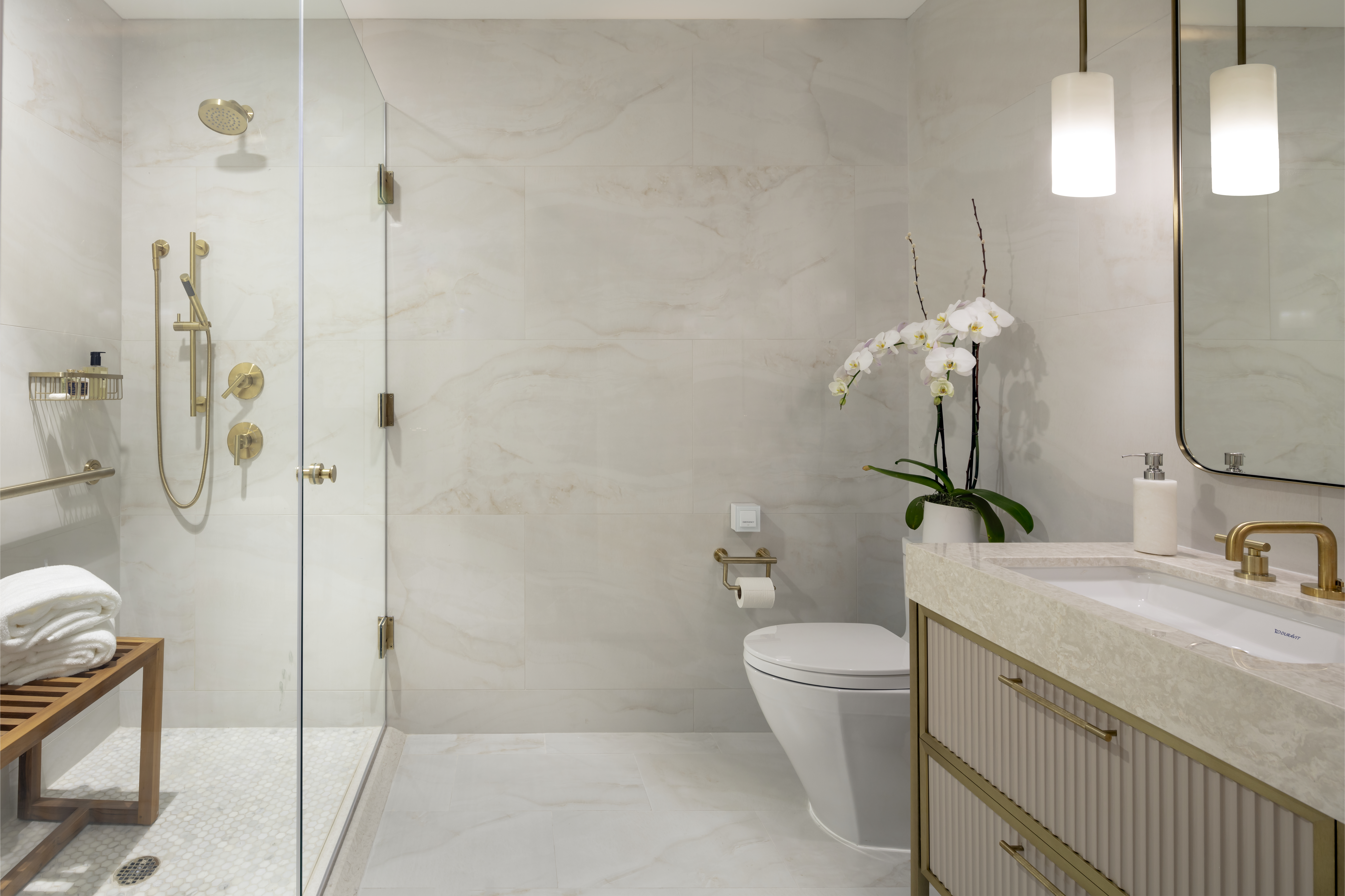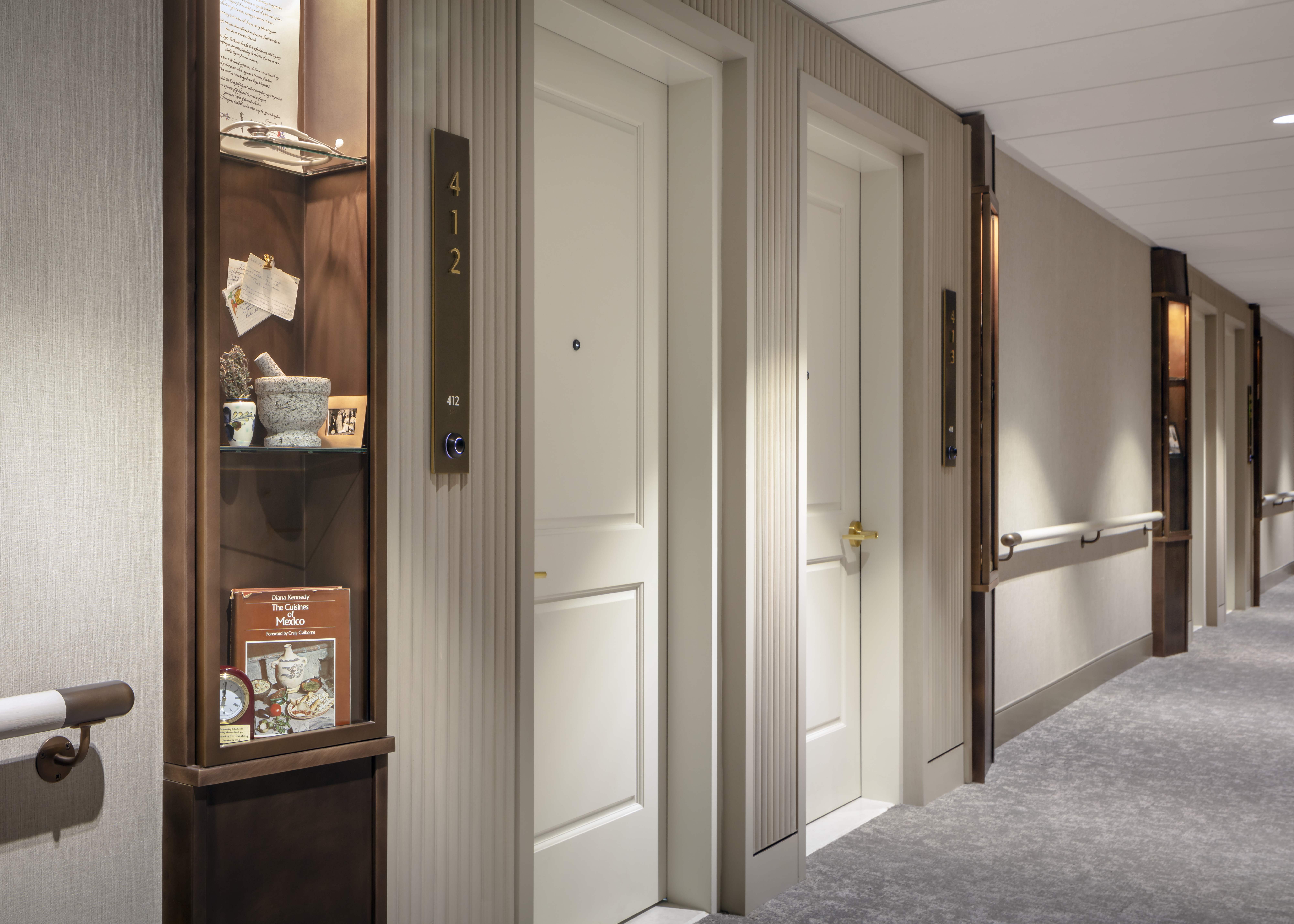 This beautifully appointed memory care studio residence features circadian lighting, waterproof floors, and decorative molding. The luxe bath has large-format porcelain tiles, integrated grab bars, an accessible shower, and a custom vanity with lockable storage. Designed to enhance the comfort and well-being of Coteries memory care residents, the residence also features a custom entryway with a brass and glass memory box to make residents feel at home.