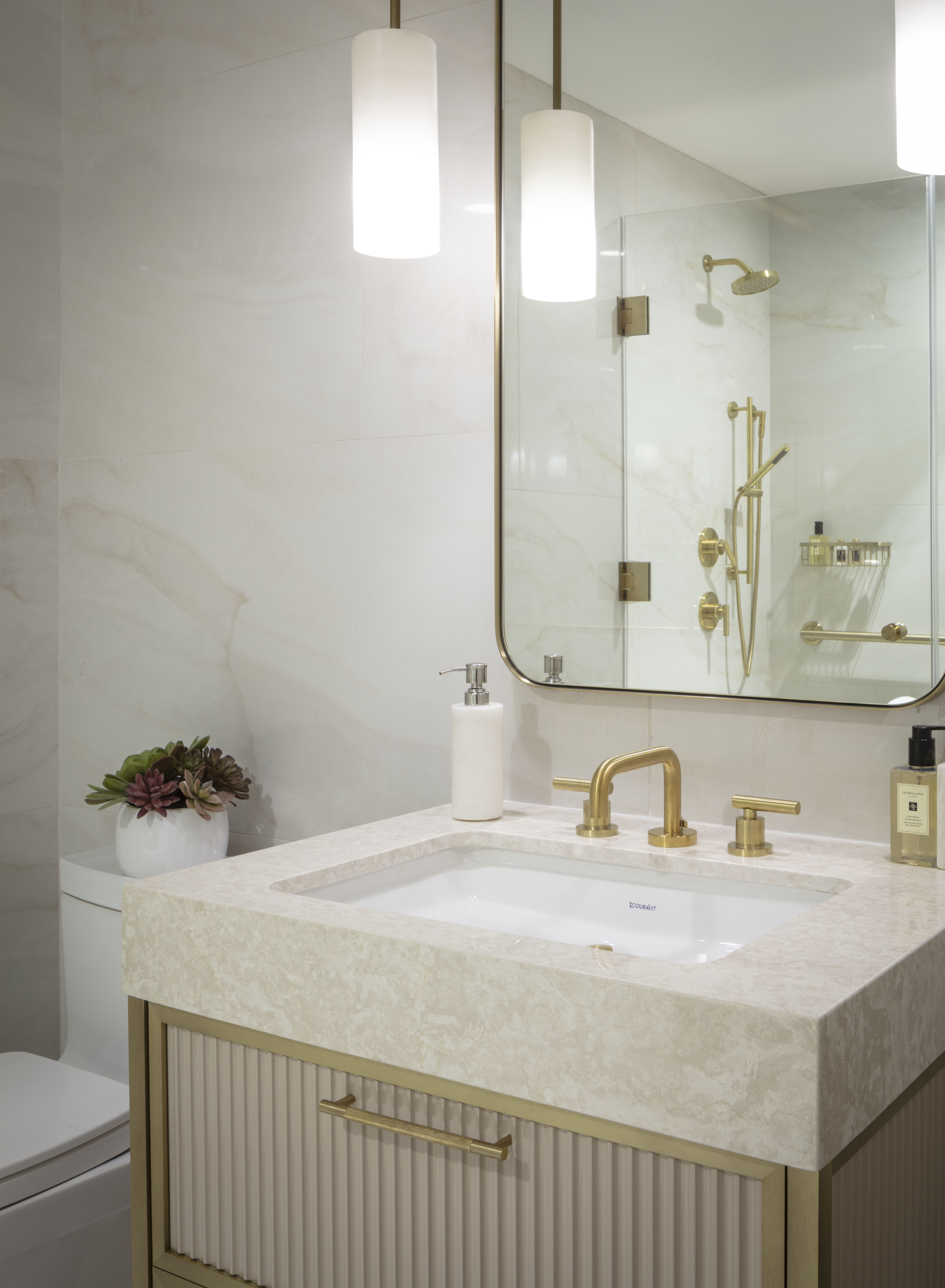 - Custom-designed vanity and Botticino marble counters (with removable base cabinet for wheelchair access)