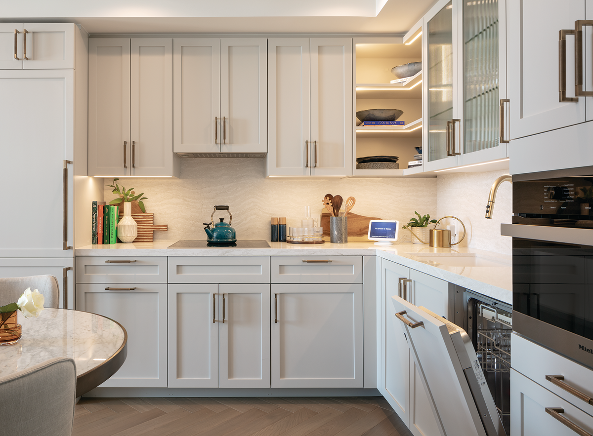 - Custom cabinetry with Cambria® Luxury Series natural quartz countertops, full-height backsplash, and under-cabinet lighting