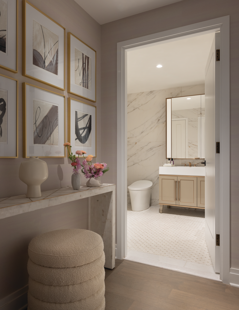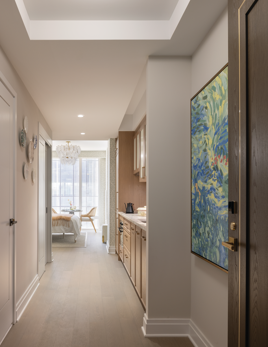 Conveniently located near the elevators, this studio unit features a larger living area with wide-plank oak flooring, a custom inset area rug, and generous closet space. The full galley kitchen is equipped with Miele® appliances, Italian cabinetry with under-cabinet lighting, Brazilian Taj Mahal quartzite countertops, and a full-height backsplash. The luxe bath is well-appointed with a heated marble mosaic tile floor, custom-designed Krion® vanity counters with Kallista fixtures, and a walk-in shower.